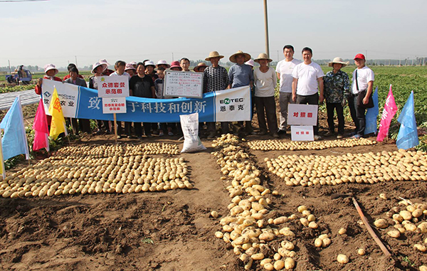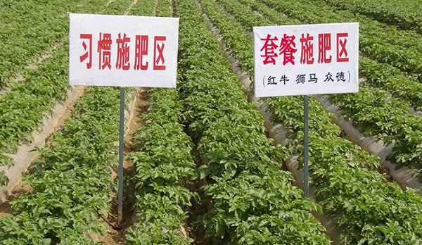 河南鄭州市滎陽高村農(nóng)民黃海望,共種6畝馬鈴薯,其中5畝用的眾德套餐,眾德生物有機(jī)肥80公斤,15-10-20高鉀型眾德牌摻混肥100斤在翻地前施用,100斤15-10-20高鉀型眾德牌摻混肥種肥同播,出苗后用態(tài)康科250倍液噴施兩次,另外一畝做對照,同等有機(jī)肥,100公斤15-15-15含量的復(fù)合肥作底肥。施用眾德牌摻混肥的馬鈴薯莖葉不旺長,發(fā)根早、根粗、苗壯,中期苗高比對照高15-20厘米,長勢好、病害少,收獲時馬鈴薯個頭大、品質(zhì)好、表面光滑,上市早,賣價高,產(chǎn)量比對照高58-60%,畝產(chǎn)達(dá)到6100多斤。