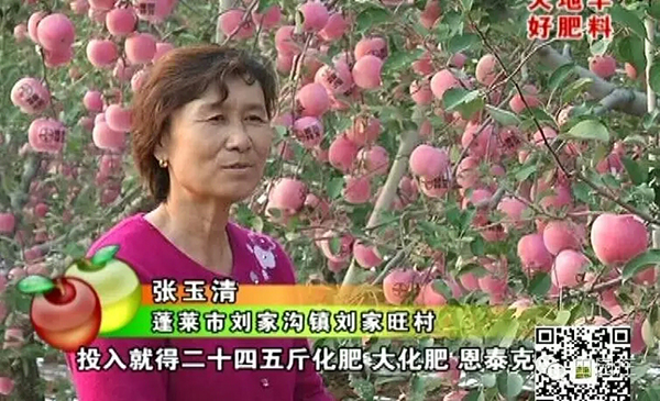 蓬萊市新港街道劉家旺村果農(nóng)張玉清,人稱“蘋果媽媽”。她種植富士,14年生,畝株數(shù)36株,株套袋數(shù)都在1000袋以上,畝產(chǎn)萬斤以上,連續(xù)7年使用眾德進(jìn)口肥套餐方案,連年豐產(chǎn)豐收,畝效益在3萬元以上。